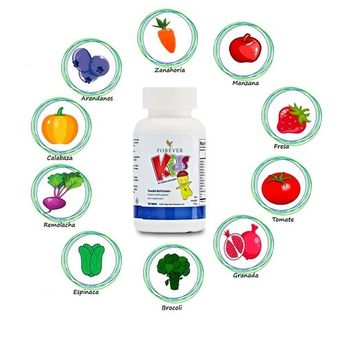 با مصرف مکمل جویدنی فوراور کیدز، شما با آرامش خاطر اطمینان دارید که نیاز روزانه فرزند شما به انواع ویتامین ها تامین شده است. این مواد مغذی گیاهی از بهترین مواد غذایی خام شامل کلم بروکلی، اسفناج، هویج و کلم بدست می آید. ویتامین های آ، سی، دی ، ای، ب6، ب12 و انواع مواد معدنی برای رشد و تقویت سیستم ایمنی کودکان است.