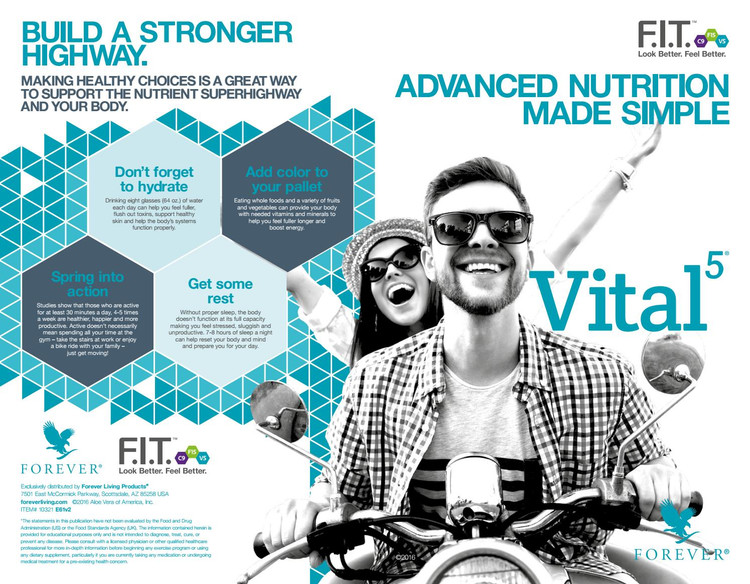 Vital5 ترکیبی شگفت انگیز از پنج محصول شرکت فوراور است که با کمک یکدیگر می توانند کلیه مواد مغذی مورد نیاز برای بدن شما را تامین نموده تا شما اندامی زیباتر و احساس بهتری داشته باشید. این محصول یک پایه محکم از مواد مغذی پیشرفته برای بدن تامین می کند که اساس تمامی برنامه های تغذیه ای است. این محصول به همراه برنامه روزانه شما، می تواند احساس مطلوب تری را برای شما به ارمغان آورد .
